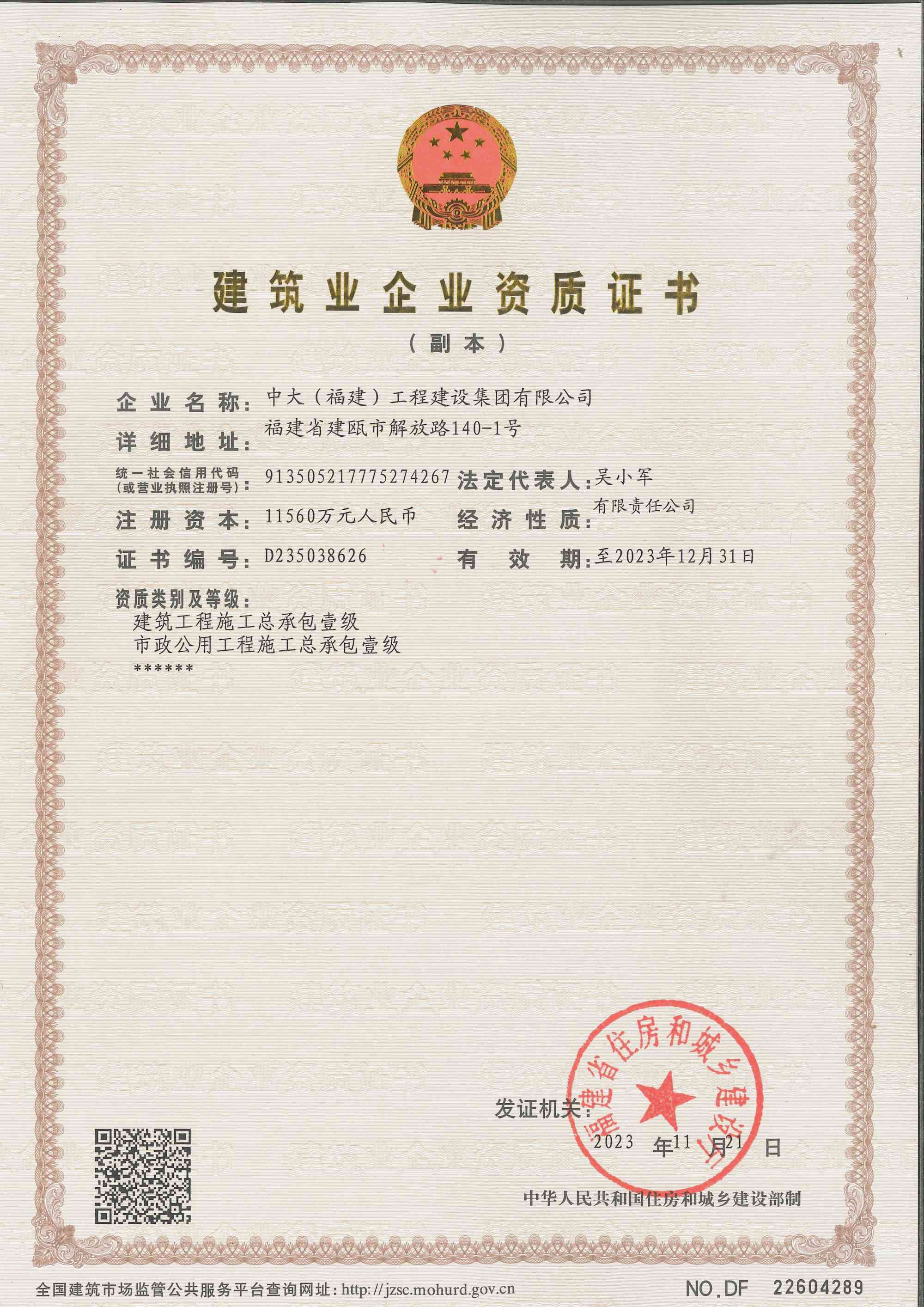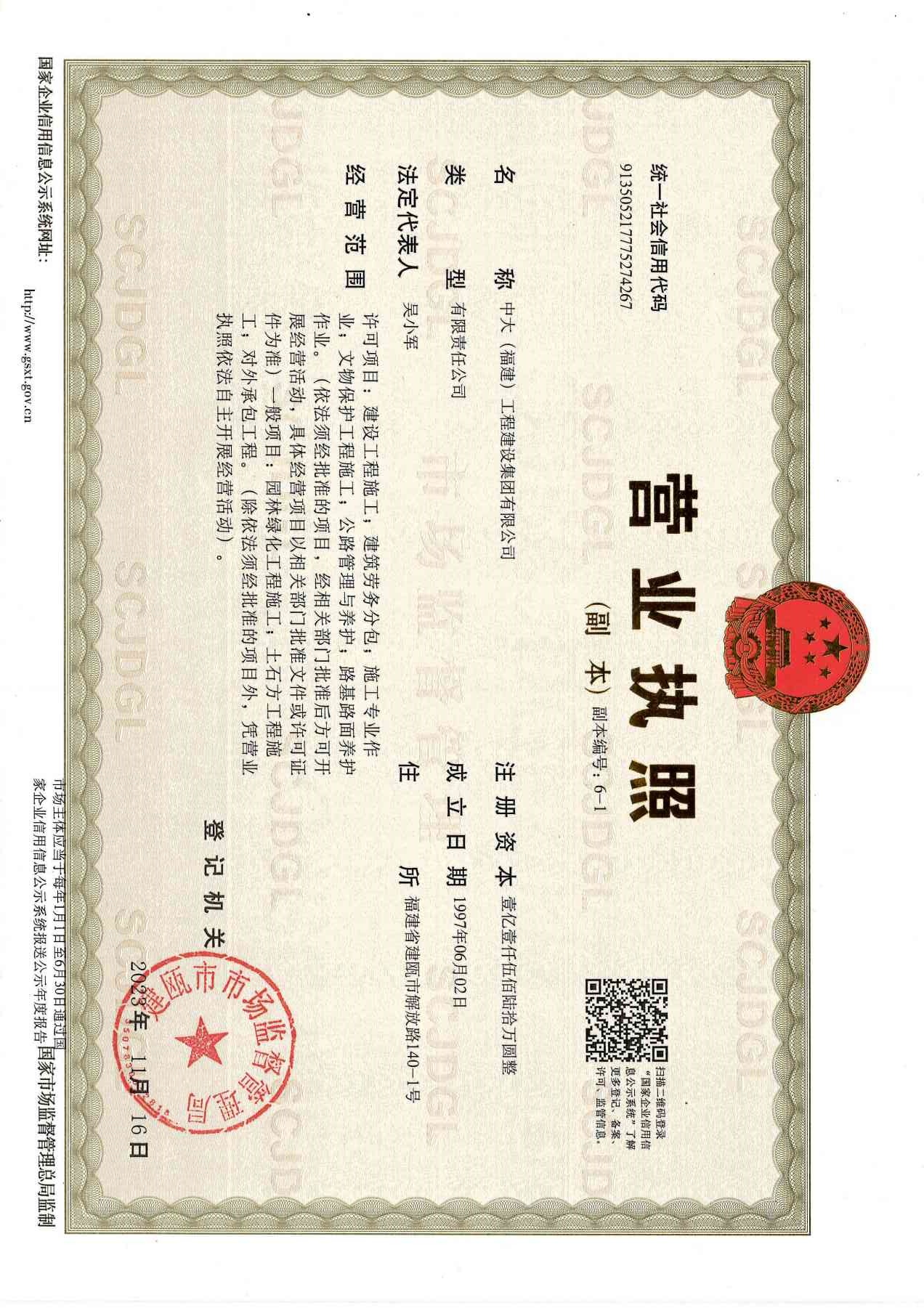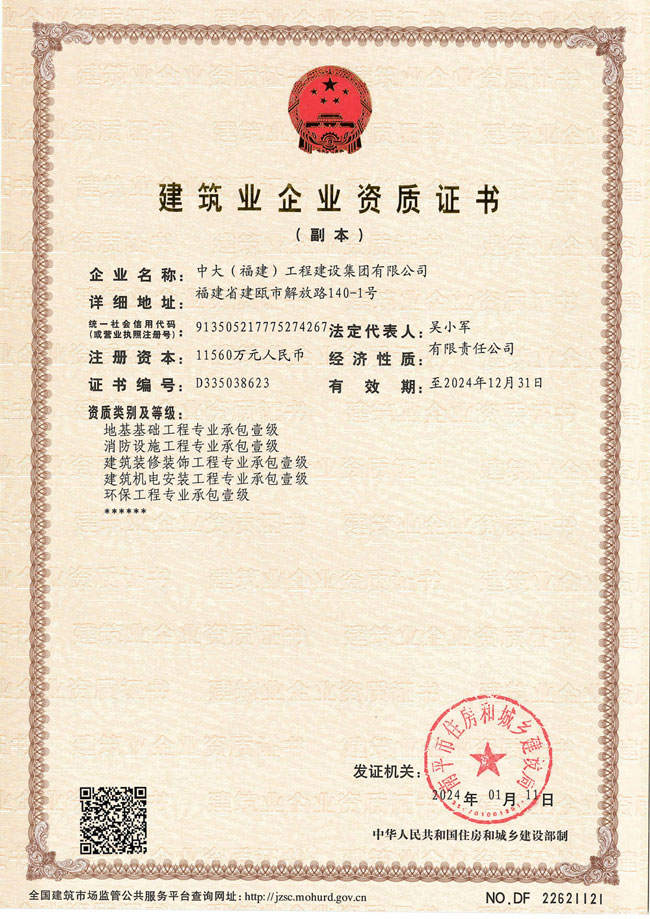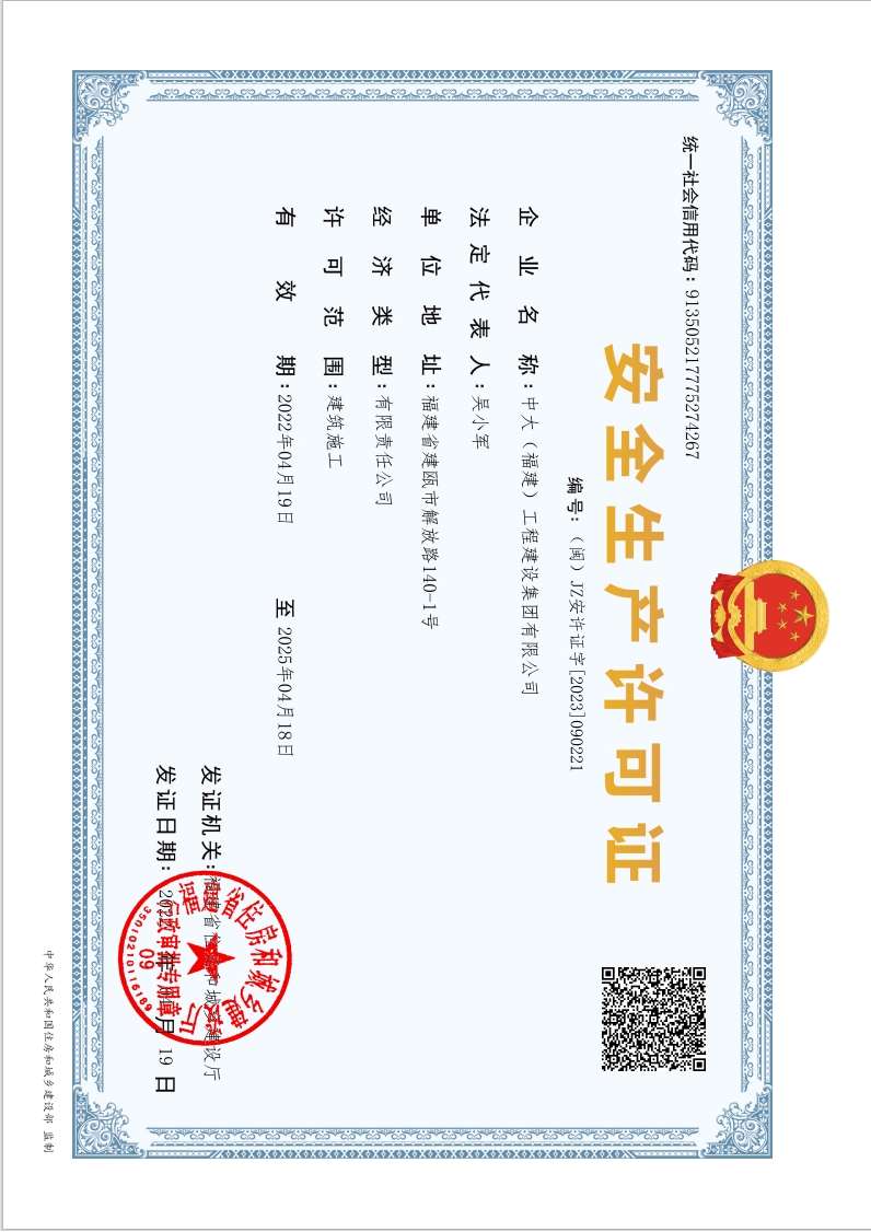 中大(福建)工程建設集團有限公司始建于1997年,總部設在“中國筍竹之都”——福建省南平市建甌市。公司注冊資本金11560萬元,年施工產值15億元以上。現有公司資質:房屋建筑工程施工總承包一級、市政公用工程施工總承包一級、地基基礎工程專業承包壹級、消防設施工程專業承包壹級、建筑裝修裝飾工程專業承包壹級、建筑機電安裝工程專業承包壹級、環保工程專業承包壹級,并取得質量、環境和職業健康安全管理體系認證。